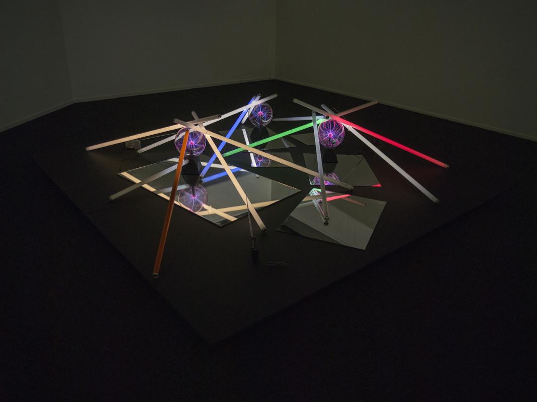 Mirrors, plasma, fluorescent lights, short wave radios and acrylic on MDF