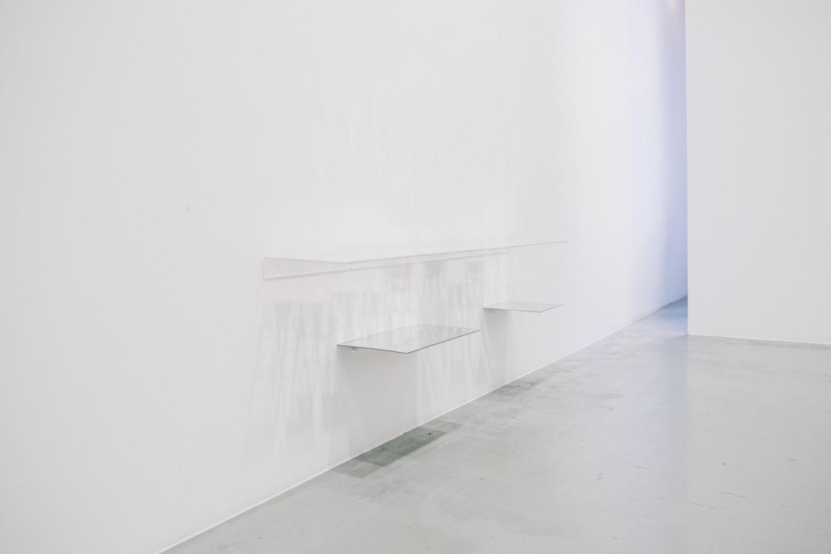25 altered contents pages on used books, 5 acrylic shelves