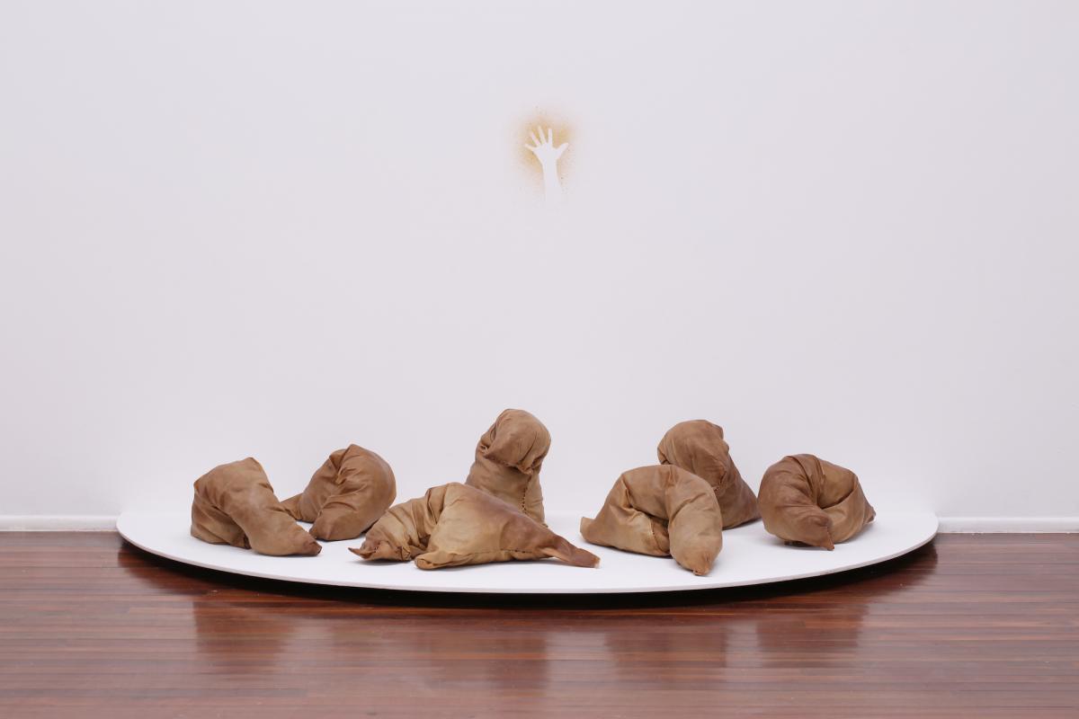 Kangaroo rawhides, coconut fibre, thread and ochre