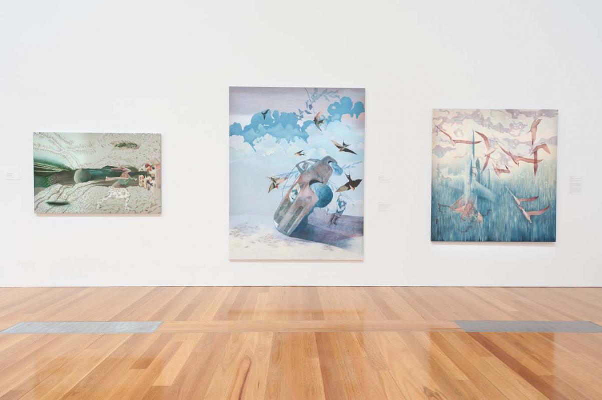 Installation view of paintings in Ten Years of Contemporary Art: The James C Sourris Collection, Queensland Art Gallery/Gallery of Modern Art (QAG/GOMA) Brisbane, 12 November 2011 — 19 February, 2012 Dream Weapon 2010 Oil and aluminium paint on polyester 110 x 170cm, Pathfinder Closing 2005 Oil on Canvas 240 x 188 cm; Choreography of War Reportage 2002 185 x 174cm