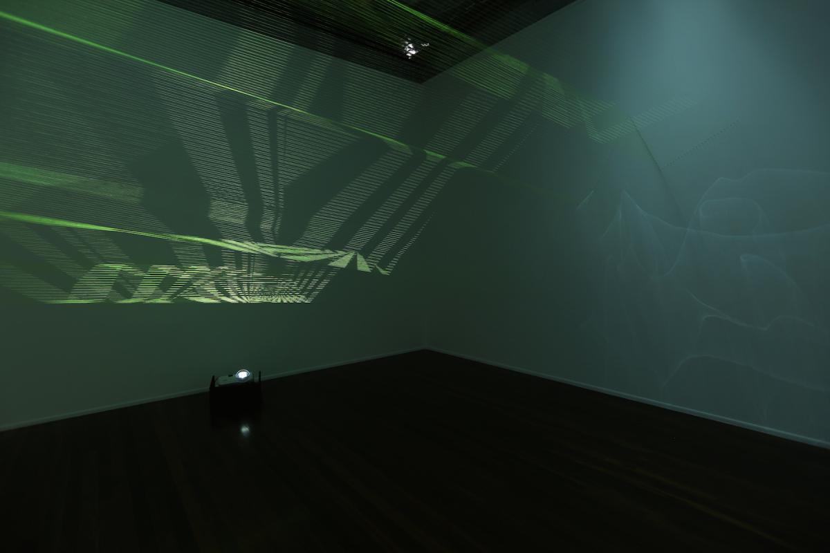 Spun polyester thread, nails, paint, 2 digital video projectors