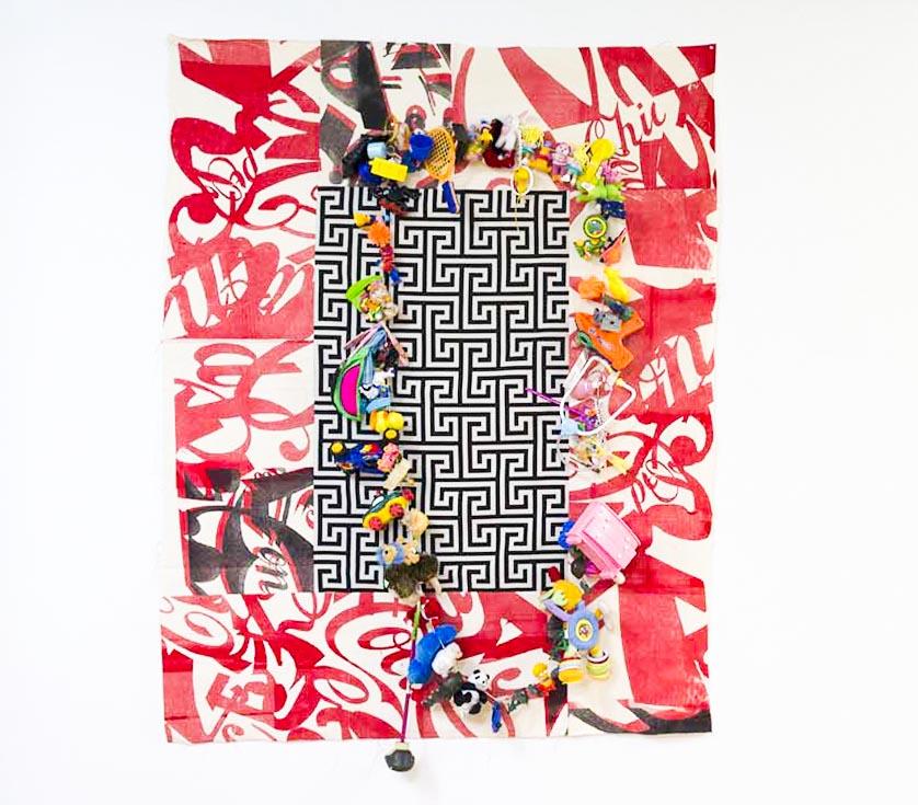 Screenprint, mixed fabric patchwork, cloth and plastic