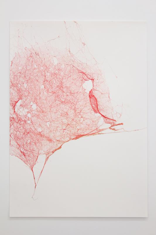 Spider silk, enamel, and adhesive on paper
