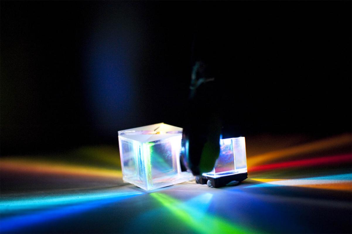 data projector optical engine, wooden plinth, LED, electric fans, found objects, custom electronics.