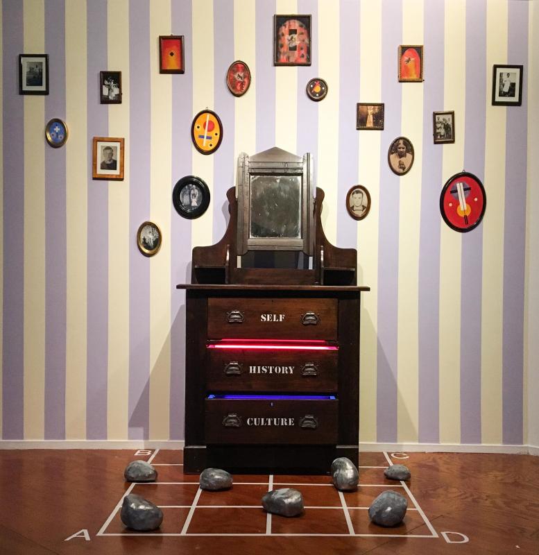 chest of drawers, watercolour, photocopies, lead, rocks, masking tape