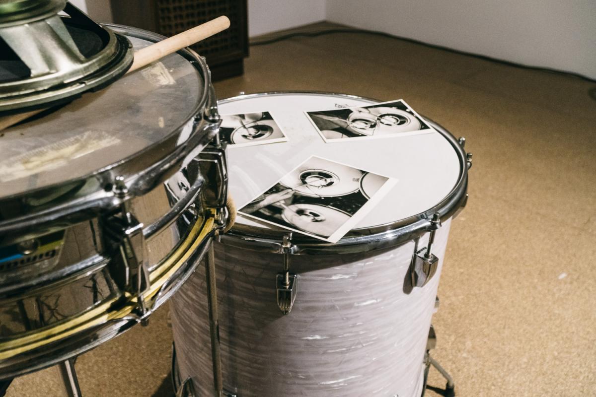 Snare drum, side drum, chair, amplifier, tape deck, speakers, drumsticks, three photographs