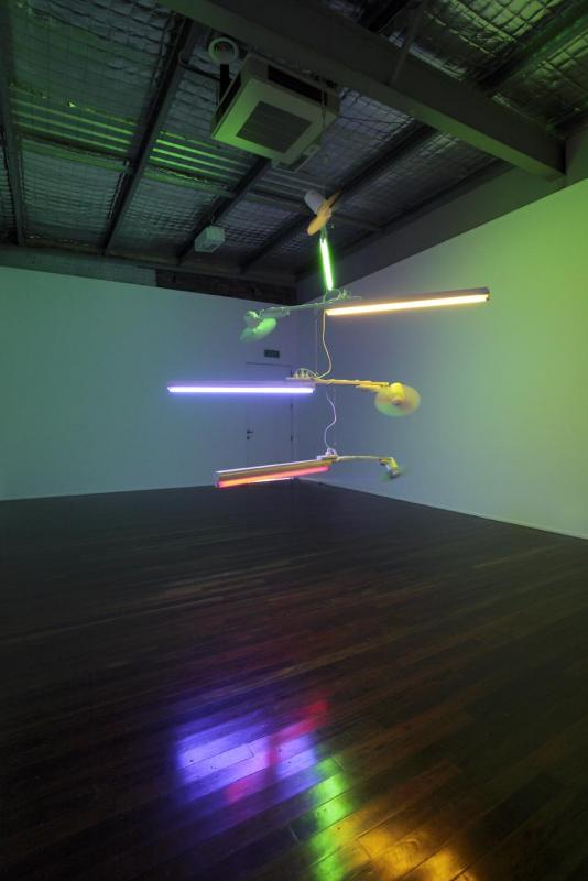 Fluorescent lights, fans, acrylic, wood, wire, rope and electrical cables.
