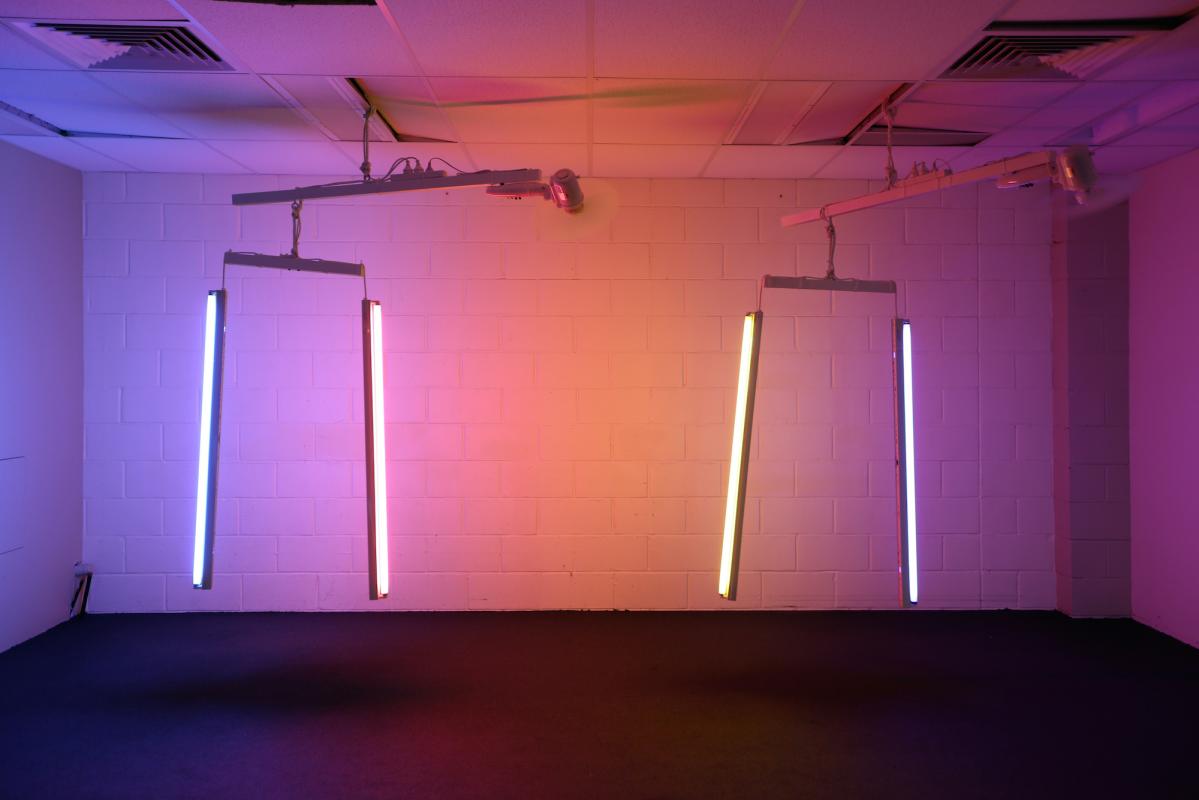 Compact fluorescent lights, oscillating fan, dowel, power board, cables