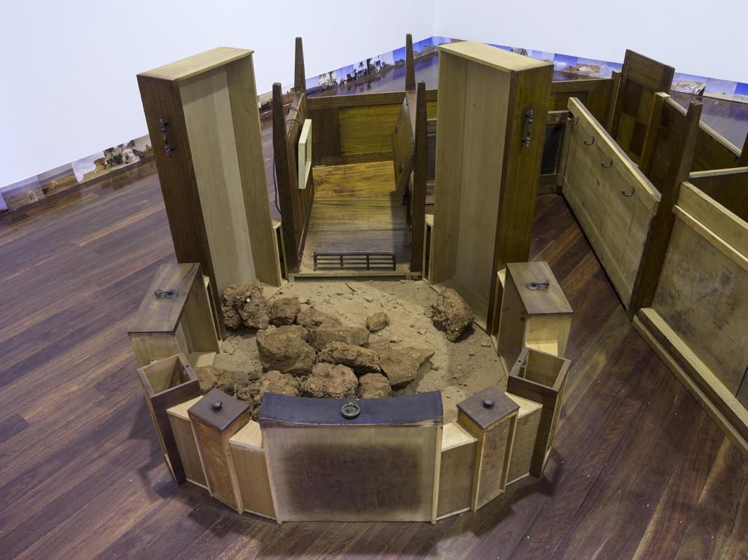 wood, soil, metal, vacuum cleaner lint, bobby pins and framed Namitjira print. Constructed from the bedroom furniture of the artist's parents