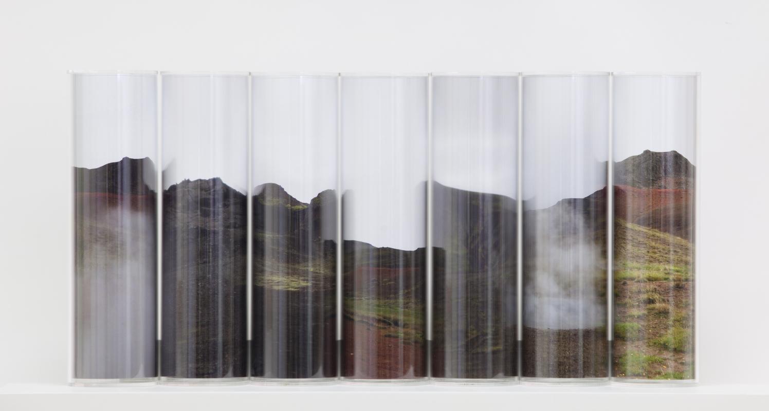 pigment prints, perspex cylinders, wooden shelf