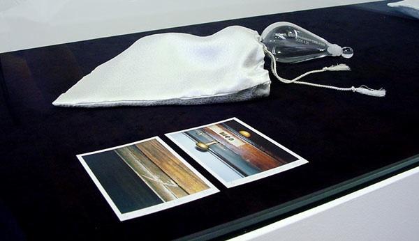 Air of cherry blossom collected outside the Imperial Palace, Tokyo, Japan. Etched glass, kimono silk, silk thread, digital print on Hahnemule paper in mylar, glass by Edison