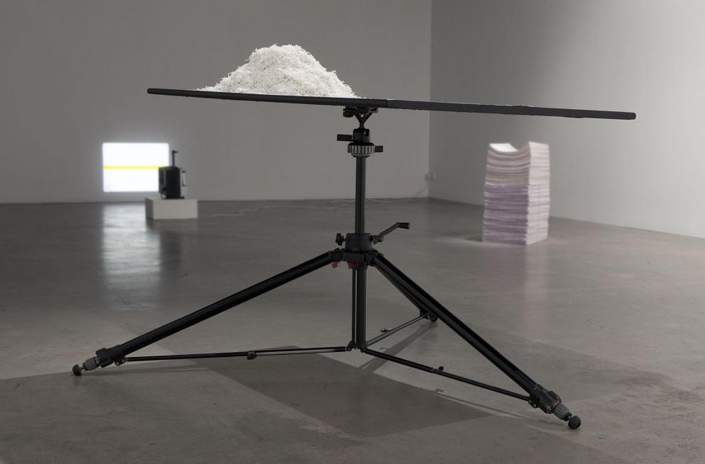 partially erased magazine page, rubber 'erasings' pile, tabletop and tripod