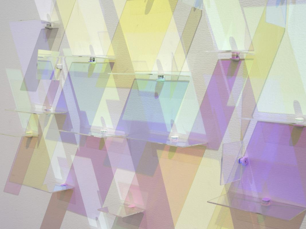 Acrylic, silver clasps and dichroic glass on canvas