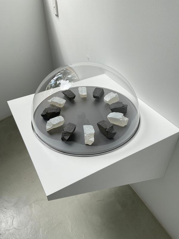 Resin, graphite, micro-pearl pigment, Perspex, wooden shelf