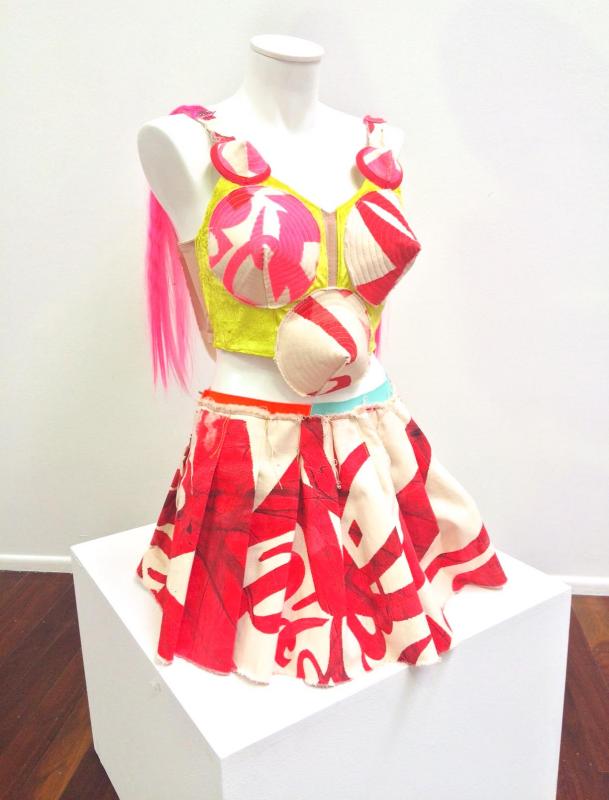 Screenprint on canvas, padded bra, elastic, faux hair, nylon piping