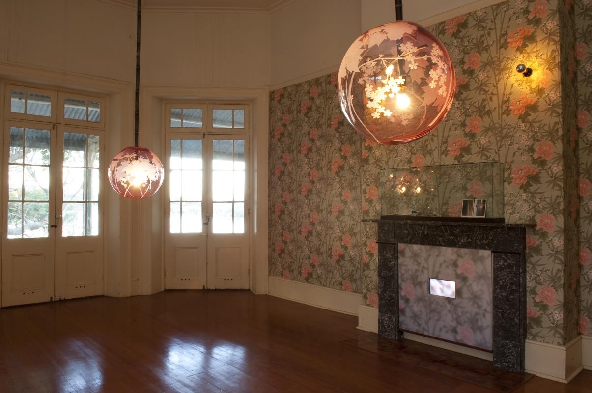 2 blown and engraved glass orbs, retro electrical cord, metal fixtures, DVD, blown and engraved glass vessel, collected air, wax, antique Japanese silk bag and tassle, 2 digital prints on Hahnemule paper