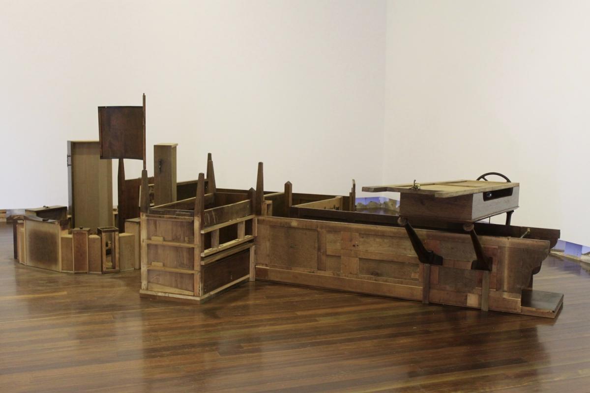 Wood, soil, metal, vacuum cleaner lint, bobby pins and framed Namitjira print. Constructed from the bedroom furniture of the artist's parents