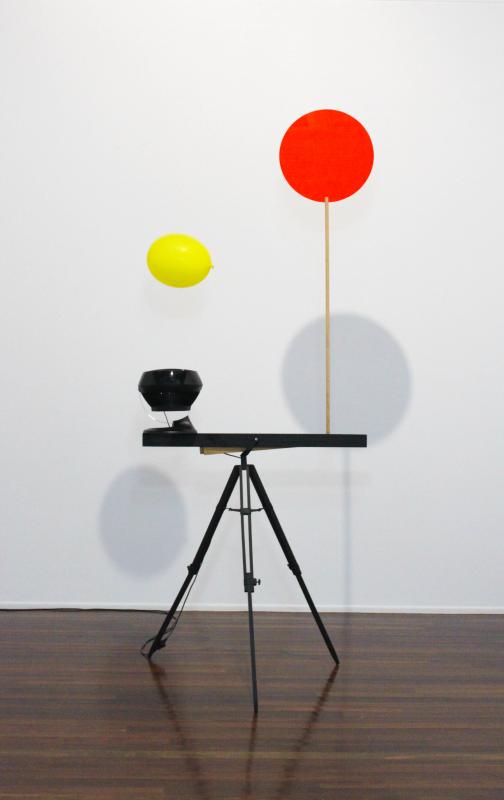 Fan, balloon, tripod, wood, thread and acrylic